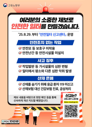 [세이프티퍼스트닷뉴스] 산업현장에서 발생할 수 있는 산재 위험 상황을 국민 누구나 온라인으로 직접 신고할 수 있는 창구가 열렸다. 고용노동부(장관 김영훈)는 1일 ‘안전일터 신고센터’를 개설하고, 현장 중심의 산업재해 예방과 은폐 차단을 강화하겠다고 밝혔다. 신고센터에서는 크게 ▲안전조치 없는 작업상황이나 ▲사고징후, ▲산재 은폐 등 세 가지 유형의 위험 상황을 접수한다. 첫째, 「산업안전보건법」상 필요한 안전보건조치를 하지 않고 작업하는 경우다. 안전모 등 보호구 미착용, 추락 방지 난간·낙하물 방지망 미설치, 폭염 작업 시 음료