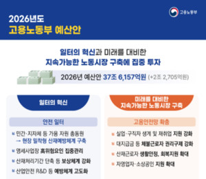 [세이프티퍼스트닷뉴스] 정부가 산업재해 예방에 사활을 걸고 내년도 고용노동부 예산을 역대 최대 규모로 편성했다. 29일 국무회의에서 의결된 2026년도 예산안에 따르면, 고용노동부 소관 예산은 총 37조 6,157억원으로 올해 대비 2조 2,705억원(6.4%) 늘어났다. 이는 최근 4년간 가장 큰 증가 폭으로, 정부는 이를 기반으로 산재예방, 공정한 노동환경 조성, 일·가정 양립 지원 등 일터 혁신을 본격화할 계획이다. 노동부 관계자는 “역대 최대 규모의 예산 중에서도 특히 안전 분야 투자가 두드러졌다”며 “규제 중심 접근에서 벗