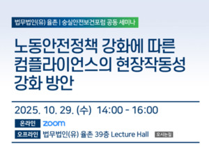 [세이프티퍼스트닷뉴스] 법무법인(유) 율촌과 숭실안전보건포럼이 오는 10월 29일 서울 율촌 39층 렉처홀에서 ‘노동안전정책 강화에 따른 컴플라이언스의 현장 작동성 강화 방안’ 세미나를 공동 개최한다. 이번 행사는 온라인(Zoom)과 오프라인으로 동시에 진행되며, 최근 강화된 노동안전정책 속에서 기업 안전보건 관리체계의 실효성을 높이는 방안을 모색하는 자리다. 중대재해처벌법 시행에 이어 강화된 노동 안전 규제는 기업들에게 안전보건 컴플라이언스를 선택이 아닌 필수 과제로 만들었다. 그러나 여전히 많은 사업장에서 형식적 규정을 넘어 실