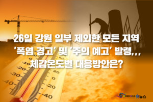 [세이프티퍼스트닷뉴스] 고용노동부가 25일 오전 11시 30분 중대재해사이렌을 통해 26일 기준으로 강원도 일부지역을 제외한 지역에 '폭염 경고 예보' 및 '주의 예보'를 발령하고, 온열질환 예방을 위해 각 사업장에서 근로자 맞춤형 폭염 영향에 대한 적극적인 대응을 당부했다. 고용노동부는 올해부터 내일의 폭염 상황을 기상청으로 받아 관심(31도씨 2일), 주의(33도씨 2일), 경고(35도씨 2일), 위험(38도씨 1일) 등 폭염 영향 예보를 4단계로 나눠 온열질환 발생 위험을 전파중이다. 무더운 날씨에 무리한 근로 활동으로 피로감