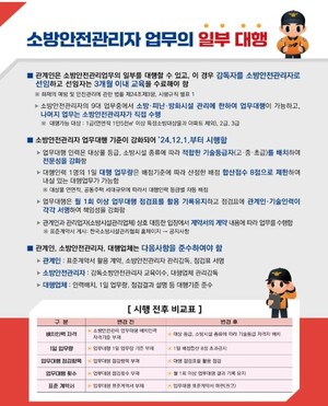 [세이프티퍼스트닷뉴스] 소방청은 오는 12월 1일부터 소방안전관리업무 대행 인력의 배치 기준과 자격, 준수사항 등을 새롭게 마련해 시행한다고 밝혔다. 이번 조치는 소방안전관리 업무의 전문성과 책임성을 높이고 안전관리 품질을 강화하기 위해 추진됐다. 새롭게 마련된 주요 내용은 ▲대행 인력의 자격 기준, ▲1일 업무량 제한 기준, ▲업무대행 점검항목 및 횟수 규정 등이다. 소방안전관리업무 대행은 관계인이 소방안전관리자 자격이 없을 경우 소방시설관리업체가 대행할 수 있도록 한 제도로, 2022년 개정된 「화재의 예방 및 안전관리에 관한