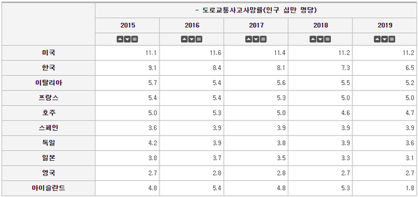 우리나라의 도로교통사고사망률은 2000년대 들어 꾸준히 감소하고 있습니다. 인구 10만 명당 도로교통사고사망자수는 2000년 21.8명에서 2019년 6.5명으로 절반 이하로 줄었습니다. 하지만 국제적으로는 여전히 높은 수준이며, 한국의 도로교통사고사망률은 영국이나 일본의 두 배 이상으로 비교대상 국가들 가운데 미국 다음으로 높습니다.