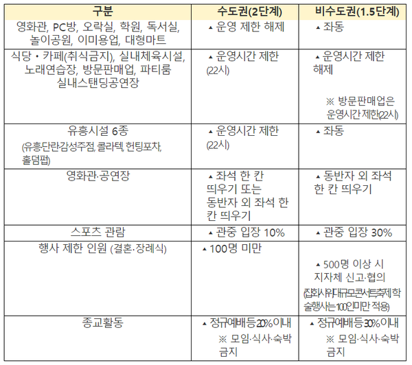 수도권은 2단계로 조정됨에 따라 영화관, PC방, 오락실, 학원, 독서실, 놀이공원, 이미용업, 대형마트 등 다중이용시설(약 48만 개소)의 운영시간 제한은 해제된다.