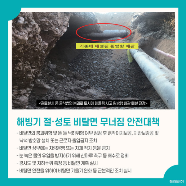 그 중에서 '해빙기 절·성토 비탈면 무너짐 사고'에 대한 사례를 살펴보고 안전조치에 대해 알아보도록 하겠습니다.