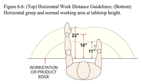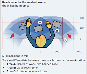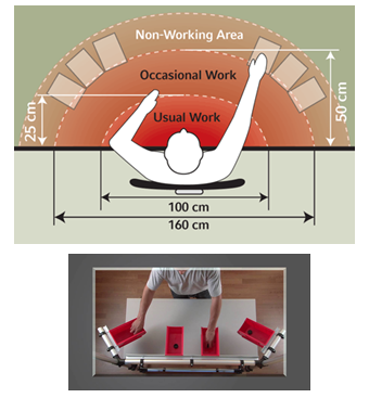 빈번하게 도달되어야 하는 아이템들은 표준 작업영역(전면 39.4cm, 좌우 119.4cm)) 안에, 전체에 가능한 근접하여 위치해야 하는 반면, 그렇지 않은 아이템들은 최대 작업영역(전면 50.8cm, 좌우 150cm) 안에 위치(배치)하면 된다. 작업자가 최대 작업영역 밖에 있는 아이템에 도달하기 위해 몸을 앞으로 숙여야 하는 때에 따라서 허용될 수는 있지만 이러한 접근은 빈번하거나 자주 발생해서는 안 된다.