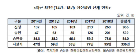 통계자료에 따르면 2014년부터 2018년까지 직장에서 얻은 정신질환으로 산재를 신청한 노동자가 966명에 달하며, 이중 336명(35%)이 자살한 것으로 나타났으며, 연도별로는 △2014년 137명(사망 47명) △2015년 165명(사망 59명) △2016년 183명(사망 58명) △2017년 213명(사망 77명) △2018년 268명(사망 95명)으로 해마다 늘고 있는 것으로 나타났다.