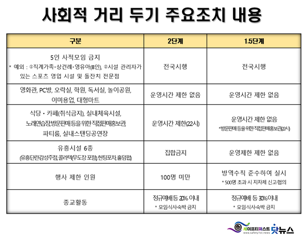 사회적 거리두기 단계가 현 단계를 3주간 유지하되, 위험한 시설및 행위등에 대한 방역조치를 강화된다.