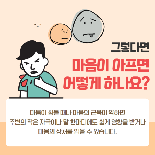 우리 몸인 신체도 아프지 않고 정상적인 기능을 할수 있도록 적절한 운동이 필요하지만, 마음이 병들면 몸도 병이 든다고 하는 말이 있듯이 마음의 근육도 적절한 운동을 통해 튼튼한 근육을 만들 필요가 있습니다.