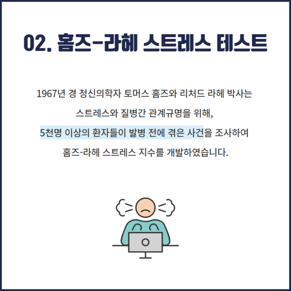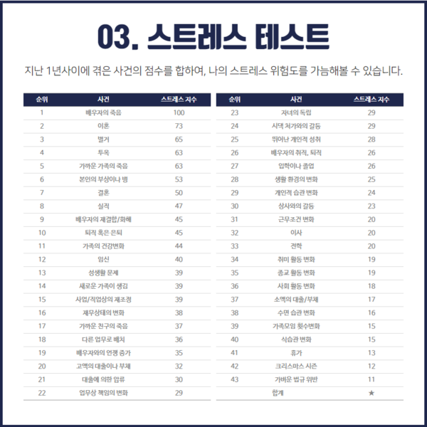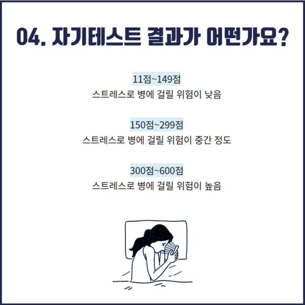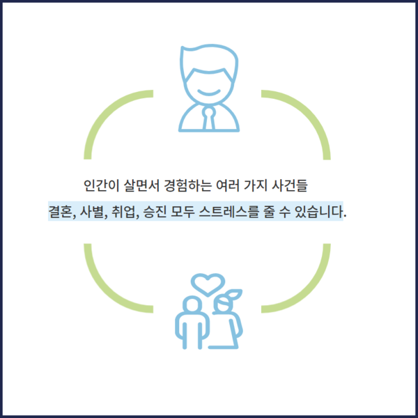 자신의 스트레스 정도는 얼마인지를 테스트를 통해 점검해보고, 어떻게 관리해야 하면 좋을지 생각해보는 시간을 갖고자 합니다.