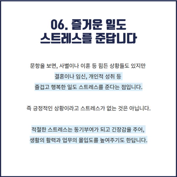 없앨 수 없는 것이라면, 스트레스를 긍정적인 방향으로 바꿀수 있는 방법을 강구하는 것이 조금은 더 자신의 건강에 도움이 될수 있는 방안같습니다.