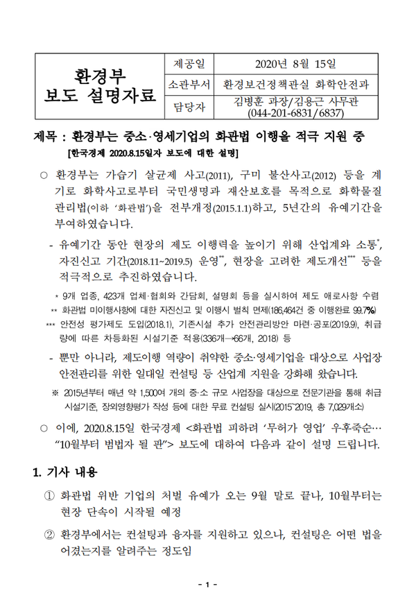 2020.8.15일 한국경제 기사의 【 화관법 피하려 ‘무허가 영업’ 우후죽순… 10월부터 범법자 될 판】의 보도에 대해, 같은날 환경부는 중소,영세기업의 화관법 이행을 위해 지원하고 있는 정부대책에 설명하며 그에 대한 반박보도를 하였다.