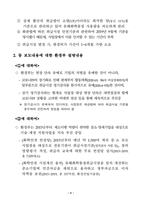 먼저 기사내용중에 ' 화관법 위반 기업의 처벌 유예가 오는 9월 말로 끝나, 10월부터는 현장 단속이 시작될 예정' 에 대해서, 환경부는 현장 단속 유예로 기업의 처벌을 유예한 것이 아니라, 코로나 19 의 장기화로 인해 관계부처 합동계획(2020.4.8, 제4차 비상경제회의)의 일부분으로 취급시설 정기검사를 한시적으로 유예(2020.4~9월)한 것이며, 상기 정기검사와는 별개로 사업장 대상 현장 단속은 대면점검과 함께 코로나19 상황을 고려한 비대면 점검 등을 통해 계속적으로 추진중이며, 정기검사가 유예되어 있더라도 사업장은 화관법에 따라 취급시설 기준을 준수하여 안전하게 영업을 하여야 한다고 설명하였다.
