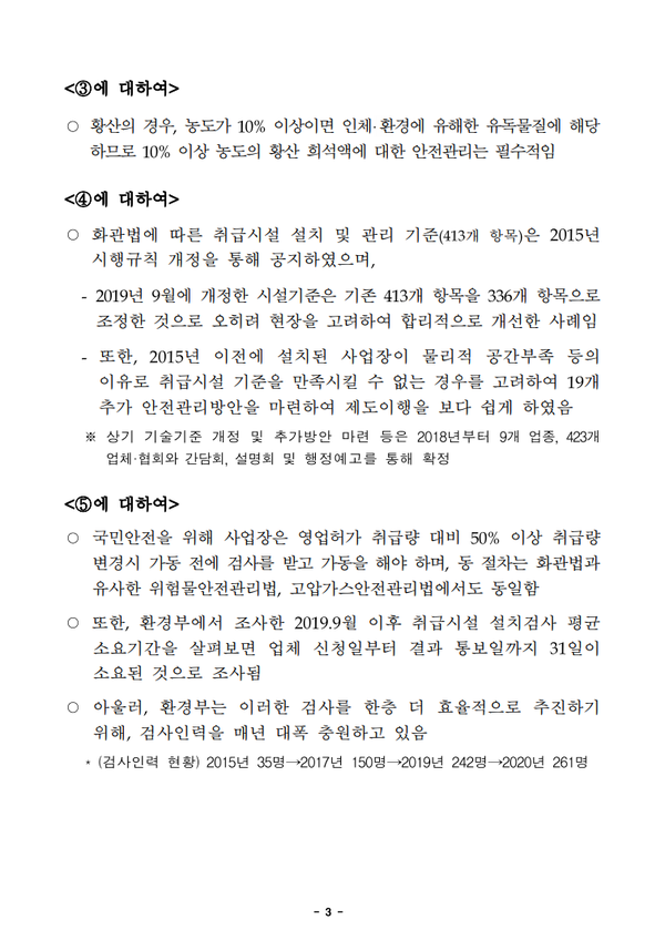 마지막으로 '취급시설 변경 시, 변경허가 기간이 1~6개월 가량 소요된다'라는 기사내용에 대해서는, 국민안전을 위해 사업장은 영업허가 취급량 대비 50% 이상 취급량 변경시 가동 전에 검사를 받고 가동을 해야 하며, 동 절차는 화관법과 유사한 위험물안전관리법, 고압가스안전관리법에서도 동일함을 밝혔고, 환경부 조사에 근거한 평균 소요기간을 살펴보면 업체 신청일부터 결과 통보일까지 31일이 소요된 것으로 조사되었으며 이러한 검사의 효울적 추진을 위해 매년 검사인력을 충원하고 있다고 밝혔다.