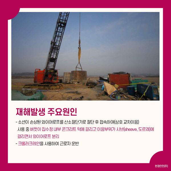 크롤러크레인(10ton)은 클램셸 버켓 또는 대형정(비트)을 연결하여 암 파쇄·반출 및 원통형 버켓을 연결하여 근로자를 인양하는 용도로 사용하였습니다. 피재자인 착암공 3명은 클램셸 버켓 및 대형정(비트)으로 1차 굴착한 부위를 착암기로 정리하는 작업을 하였습니다. 피재자 3명이 집수정 바닥면에서 굴착면 마무리 작업 후 크롤러크레인(10ton)에 와이어로프로 연결된 버켓에 탑승하여 지상으로 올라오던 중, 버켓이 집수정 내부 콘크리트 턱에 걸리고 와이어로프 이음매가 시브(sheave, 도르래)에 걸려 분리되면서 집수정 굴착면 바닥으로 버켓과 함께 추락(h≒9m)하여 2명이 사망하고, 1명이 부상을 입었습니다.