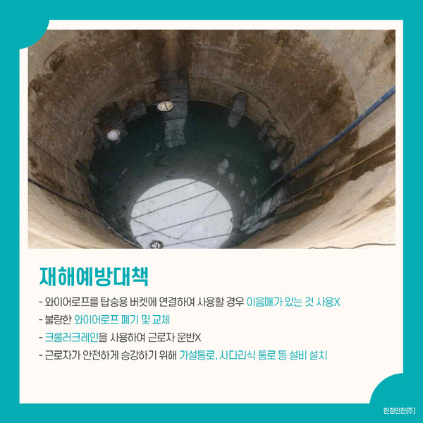- 와이어로프를 탑승용 버켓에 연결하여 사용할 경우 이음매가 있는 것을 사용해서는 안되나, 소선이 손상된 와이어로프를 산소절단기로 절단 후 접속하여(상호 교차이음) 사용 중 와이어로프가 분리되었습니다.