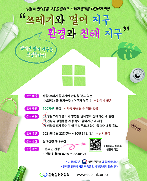 환경실천연합회(회장 이경율, 이하 환실련)가 수도권(서울, 경기, 인천) 거주자를 대상으로 생활 쓰레기 줄이기 실천 가구를 모집한다.