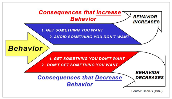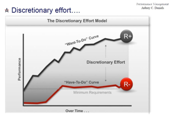 - Aubrey C. Daniels은 인간의 행동특성관리 연구 (4 rules of positive reinforcement) 에서 뭔가 원하는 것을 얻으려고 할 때 또는 원하지 않을 것은 피하려고 하는 행동 특성의 적극성은 늘어나고, 원하지 않는 것은 행할 때나 원하는 것을 얻지 못할 때는 행동이 소극적인 결과로 이어진다. 자유재량 노력 모델(discretionary effort model)에서 업무수행 성과와 시간경과 대비 의무감(have-to-do)에 의한 업무수행은 최소 업무 요구조건만 충족하지만 본인의 의지(want-to-do)에 의한 업무수행의 경우 효과(성과)가 훨씬 높다고 지적하고 있다.