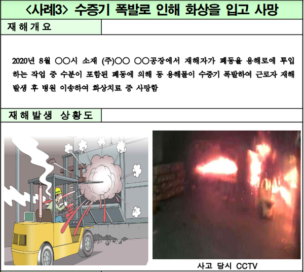 [세이프티퍼스트닷뉴스] 지난해 8월 용해로 작업중 재해자가 폐동을 용해로에 투입하는 작업 중 수분이 포함된 폐동에 의해 동 용해물이 수증기 폭발을 일으켜 근로자가 화상재해를 입고 병원으로 이송되었으나, 화상치료중 끝내 사망한 사고가 발생했다.