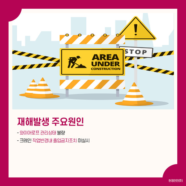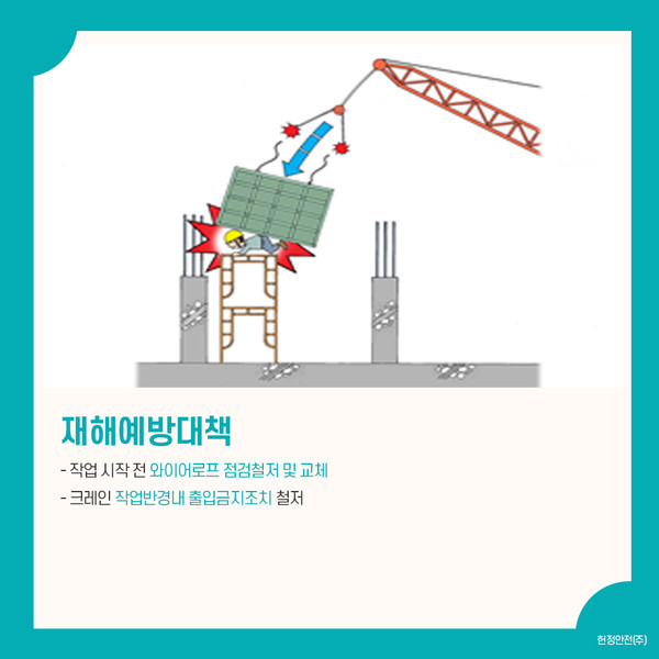 - 거푸집 등 중량물 인양시 걸고리 와이어로프가 이탈 또는 파단되어 재해위험이 있음에도 불구하고 작업반경 내에 근로자가 출입하였습니다.