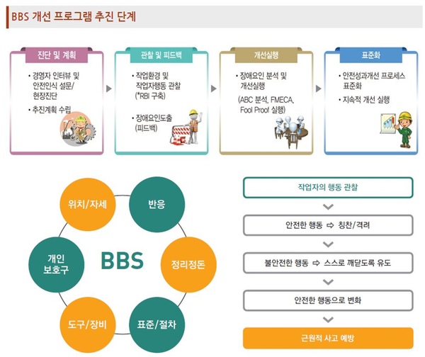 제조 또는 건설 현장의 Human error을 줄이기 위한 전략과 전술의 수단으로 근로자의 불안전 행동을 최소화하기 위한 BBS 개념을 도입하여 접목하는 방안이다. 근로자의 안전 행동과 안전 심리에 집중하는 것이다.