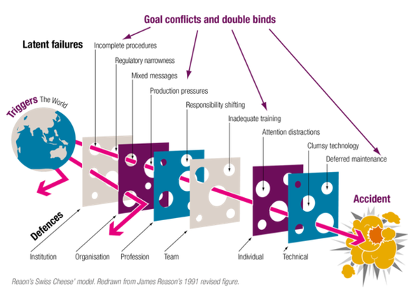 사고 발생 관련 원인 제공/인자(triggers)에 대하여 각 단계별 방어벽(layer)이 존재하고 그 방어벽에 노출된 여러 문제점들이 상존하면 방어벽을 통과하여 다음 단계로 진출하여 최종 사고가 발생하는 과정을 설명하는 모델이다