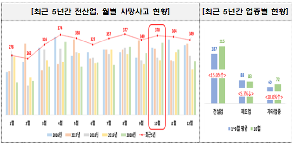 -휴일 많은 10월 사망사고 다발, 건설업은 최근 5년 월별 평균보다 28명(+15%) 많아 각별 주의