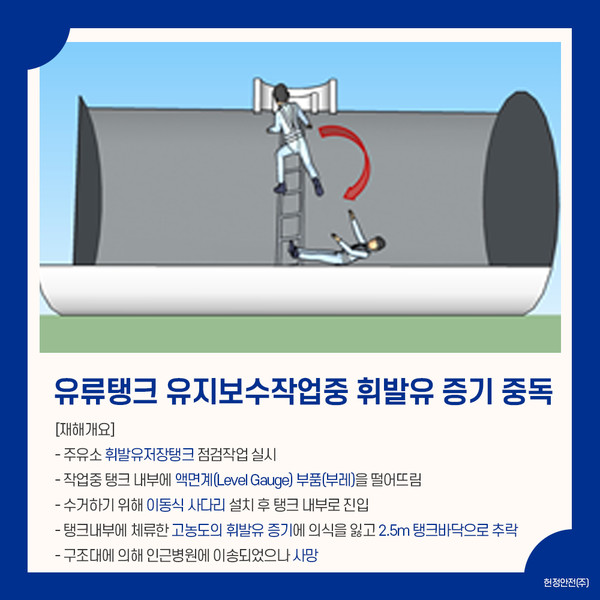 주유소 휘발유 저장탱크 점검작업중 탱크내부에 떨어진 액면계(Level Gauge) 부품(부레)을 수거하기 위해 이동식 사다리를 설치한 후 탱크 내부로 내려갔습니다. 재해자는 탱크내부에 체류한 고농도의 휘발유 증기에 의식을 잃고, 깊이 약 2.5m 탱크바닥으로 떨어져 119 구조대에 의해 인근 병원에 이송되었으나, 사망한 안타까운 재해입니다.