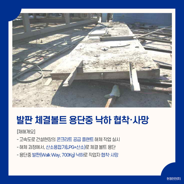 고속도로 건설현장의 콘크리트 공급 플랜트 해체 과정에서, 산소용접기(LPG+산소)로 체결 볼트 용단 중, 발판(Walk Way,=700kg) 낙하로 작업자가 협착되어 사망한 사고입니다.