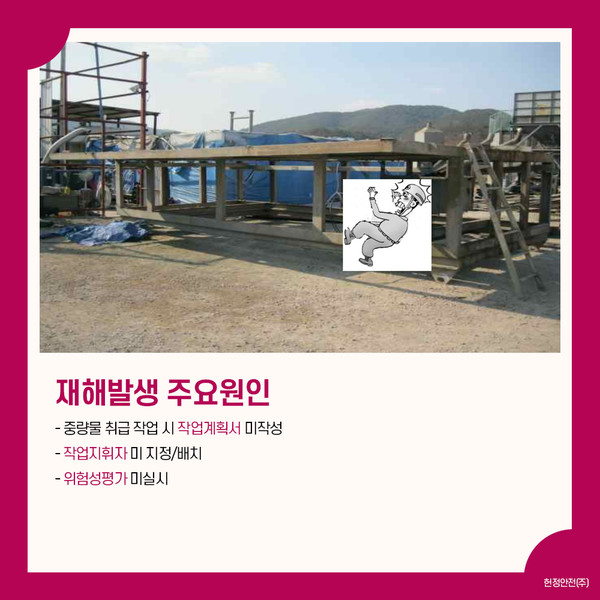 - 작업계획서의 절차에 따른 단계별 위험성을 평가하여, 중량물(발판) 낙하방지조치를 취하는 등의 안전조치를 이행하여야 함에도, 위험성평가를 실시하지 않고 작업을 진행하였습니다.