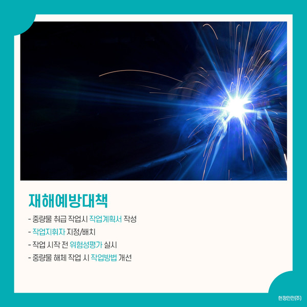 - 중량물을 취급작업 시, 작업계획서(중량물 종류/형상/취급방법/순서)를 작성하고 반드시 해당 근로자에게 사전 교육을 시켜야 합니다.