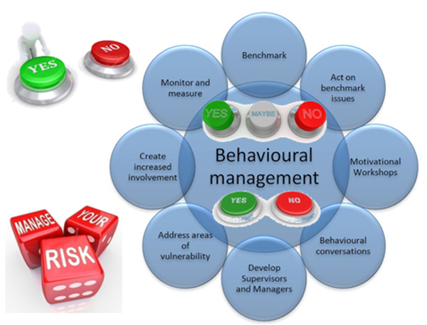 휴먼에러 예방 관련 인간의 행동 관리 영역은 크게 8개 분야로 구분하여 응용하면, 선진 사업장 추진사례 벤치마킹, 벤치마킹 이슈 실행(응용), 현장 안전 행동 위한 동기부여, 행동 변화 소통, 감독자와 관리자 이해 확충/전개, 취약분야 재점검/보완(대처), 참여자 확대, 모니터링/측정 등의 단계로 일련의 과정을 볼 수 있다.