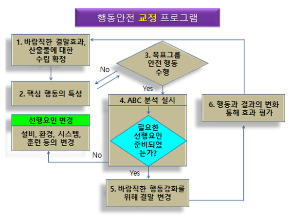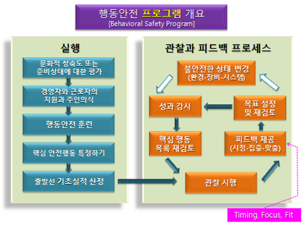 행동 안전 프로그램의 개요를 보면, 먼저 실행 단계에서 문화적 성숙도 또는 준비상태에 대한 평가를 시작으로 경영자와 근로자의 지원/협력과 주인의식의 기반 위에서 행동 안전 교육과 훈련이 요구되고 수행되어야 한다.
