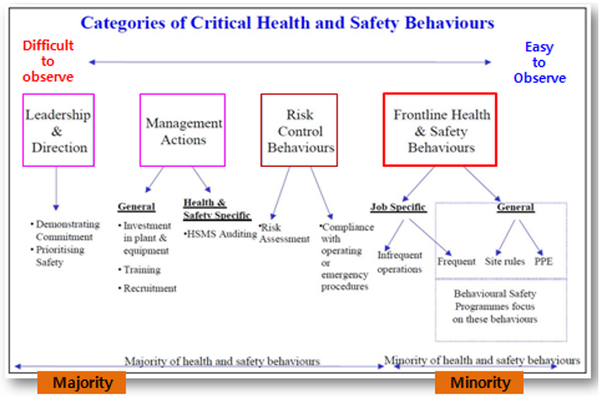 안전보건분야의 중대한 행태 범주는 크게 4가지로 리더십과 추진방향, 관리 실행, 위험요소관리 행태 및 생산현장(근로자 업무 조건) 안전보건 행태 등으로 구분 짓는다. 좌측으로 갈수록 파악과 관찰이 어려우며, 우측으로 갈수록 관찰과 파악이 용이하다.