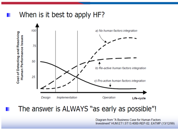 인간업무수행 이슈 검증과 해결 관련 비용 대비 Life-cycle 단계별 변화에서 인적 인자 통합(융합) 관리 프로그램이 없는 경우, 디자인 및 개선 실행 이후 적용(operation) 단계에서 비용의 급상승 곡선 경향을 초래하며, 반응에 대한 반작용 통합 프로그램(re-active)도 비용이 완만하게 상승하고 있다.