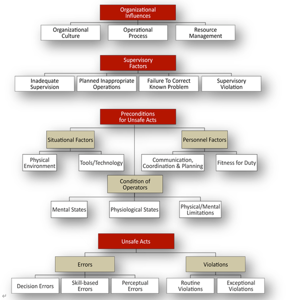 불안전한 행동의 선결조건으로는 작업자의 표준 이하(불충분한)의 조건에서는 해로운 정신상태, 해로운 생리상태 및 육체적/정신적 한계성 등이며, 작업자의 불충분한 실행 조건에서는 조원 또는 반원(crew resource)의 단속 소홀(그릇된 관리) 등이 변수 등이 불안전한 행동에 영향 변수이고, 마지막으로 불안전한 행동은 에러 차원에서는 결정 에러, 숙련기반 에러 및 지각력 에러 등이고, 위반 차원에서는 일상적인 위반과 예외적 위반 등이 해당된다.