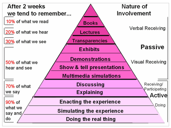 - Cone of Experience(경험의 원추) 이론에 따르면 교육/훈련 실행 2주 경과 후에 기억의 정도를 비교하면 강의는 20%, 전시, 설명회 또는 멀티미디어활용 시뮬레이션 등은 50% 정도 기억하고, 주제에 대한 토의와 상세한 설명 등은 70%, 경험에 근거한 실행, 경험에 근거한 시뮬레이션, 실질적으로 행해보는 것 등은 90% 이상의 기억되는 경향을 나타내고 있다.