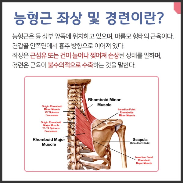 능형근은 어깨뼈를 모으기도 하고, 하방으로 회전시키기도 하여 어깨뼈 움직임 안정화를 담당하는 근육입니다. 오랫동안 앉아 있는 습관은 어깨뼈가 앞으로 내밀어져 있는(굽은등, 라운드 숄더) 경우가 많은 데 이런 경우 능형근은 늘어나면서 장력이 발생되어 신장성 약화가 되어 근육에 통증을 유발하게 됩니다.