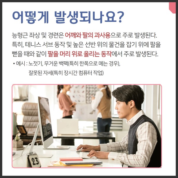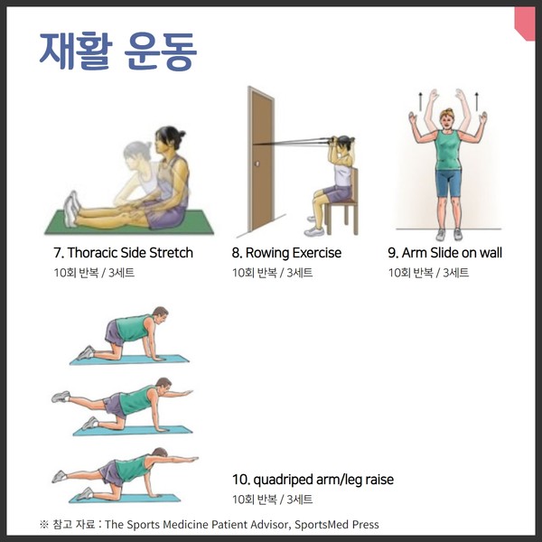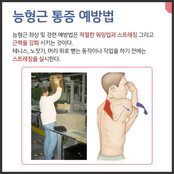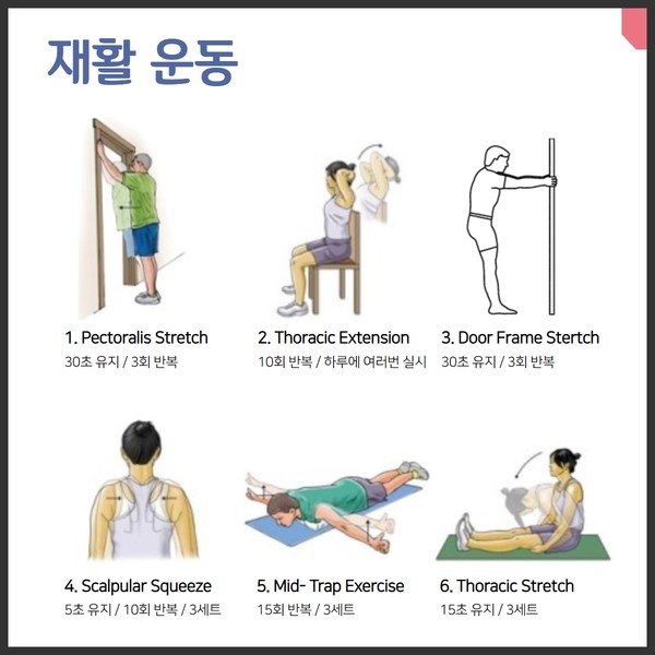 따라서 어깨 및 팔을 움직이거나 작업을 하기 전 충분히 이완 시켜주고 평상시에는 바른 자세를 유지하면서 활성화 운동을 해줘야 합니다.
