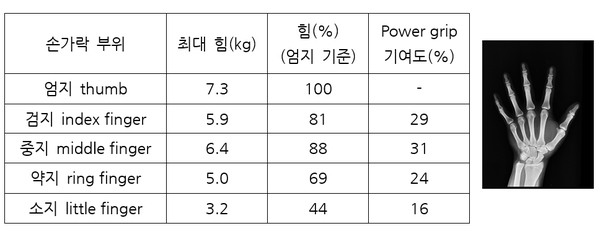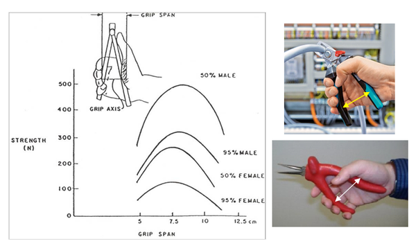 수공구 사용 관련 힘 부하 요구시 앙력 관련 손가락 간격별(grip span) 힘 부하 정도는 7.5cm 범위에서 가정 높다. 단 인체측정학 측면에서 손과 손가락 크기(size)를 고려하여 해석이 필요하다.