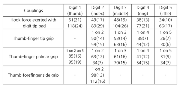 ▶ 남학생(21명)과 남성 기계공(12명)이 가하는 손가락, 잡기, 잡는 힘 분포 [평균(표준편차)]