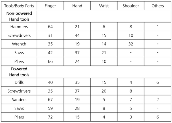 - 무동력 수공구 사용 관련 상지(arm & shoulder) 손상 비율 현황에서 해머, 스크루드라이버, 렌치, 톱, 플라이어 등의 사용 관련 손가락 부위의 피해가 많으며, 특히 해머와 플라이어 사용 관련 손상 비율이 높으며, 다음으로 손 부위의 피해도 크다.
