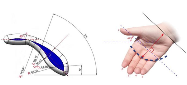 ERGOLAP 프로젝트에서 개발 된 핸들 디자인의 기하학적 구조와 관련하여(그림 3a), 세 가지 중요한 매개 변수로 설명. 이들은 "하위직경"(DI), "중앙직경"(DM) 및 "상위직경"(DS)이다. 중앙직경(DM)은 다음에 정의 된 직경과 일치한다. 핸들 곡률의 변곡점(그림 3a). 또한 손의 위치를 정의하며, 모든 외과의에게 이 직경은 선과 일치하기 때문에 세 번째와 네 번째 사이에 정의된다. (그림 3b).