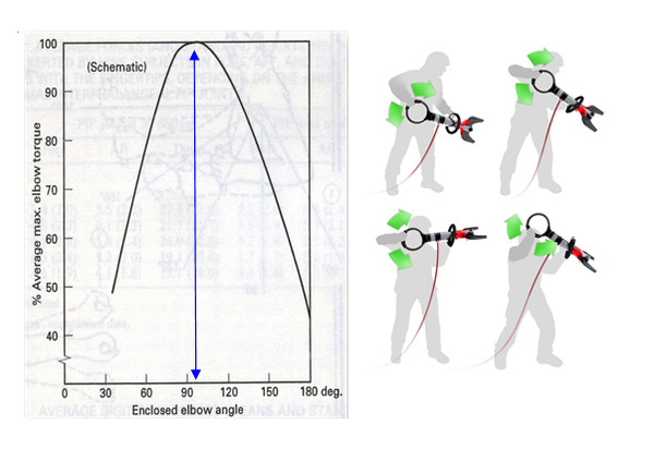 반대로 밀기 동작 시에는 팔꿈치 각도가 180도 일 때 상지 좌우 125~148 N 범위까지 힘 쓰기가 가능하며, 밀기와 당기기 작업시 엘보우 각도는 150~180도 정도의 작업 자세에서 작업을 수행하는 것이 신체 손상을 최소화하며 힘 쓰기가 용이하다.