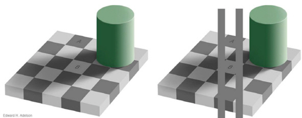 아래의 그림에서 A가B보다 어둡게 보이지만 사실은 같다. B는 그림자 안에 있기 때문에 우리의 뇌는 원래보다 더 어둡게 해석한다. 더 어둡게 보이는 상태에서 A와 B의 밝기가 같다는 것은 B가 A보다 더 밝을 때만 가능하다. 그래서 우리의 뇌가 가짜를 만들어내는 것이다. 이처럼 인간의 지각은 뇌가 만들어낸 착각에 불과하기 때문에 지각을 그대로 믿을수는 없다.