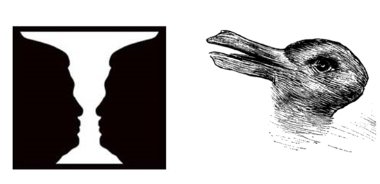 아래의 그림에서 컵과 사람의 얼굴, 오리와 토끼를 동시에 볼 수 있는 사람은 없다. 결국 둘 중의 하나를 선택하여 조직화해야 사물을 이해할수 있다.