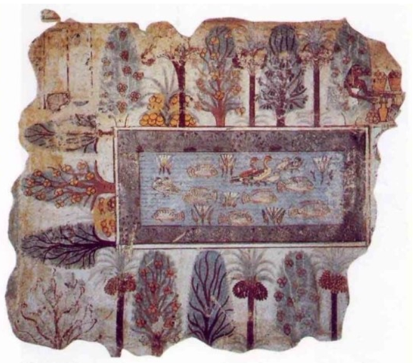 네바의 정원도 마찬가지이다. 그림 가운데 있는 연못은 분명 위에서 내려다 본 그림이지만 그 안에서 놀고 있는 오리는 옆에서 본것처럼 그려져 있다. 주위의 나무들도 마찬가지이다. 이러한 그림이 나오게 된 이유는 이집트인들이 그림을 그리는 실력이 부족했기 때문이 아니다. 그들은 단지 사물의 본질을 최대한 표현하려고 애를 썼을뿐이다.