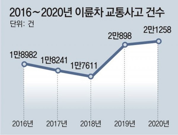 소비자들의 음식 주문이 증가함에 따라 오토바이 배달 건수가 늘면서 사고 또한 급증했다. 도로교통공단 교통사고분석시스템(TASS)에 따르면 지난해 전국 이륜차 교통사고 건수는 2만 1258건으로 최근 5년간 최대치를 기록했다. 사망자수 또한 19년도보다 5.4% 증가한 525명이라고 한다.