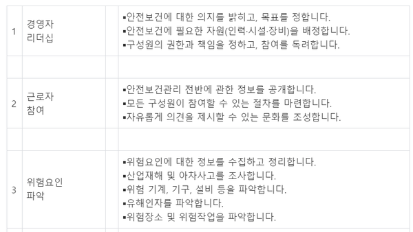 1. 경영자 리더십: 경영자가 ‘안전보건경영’에 대한 확고한 리더십을 가져야 한다.