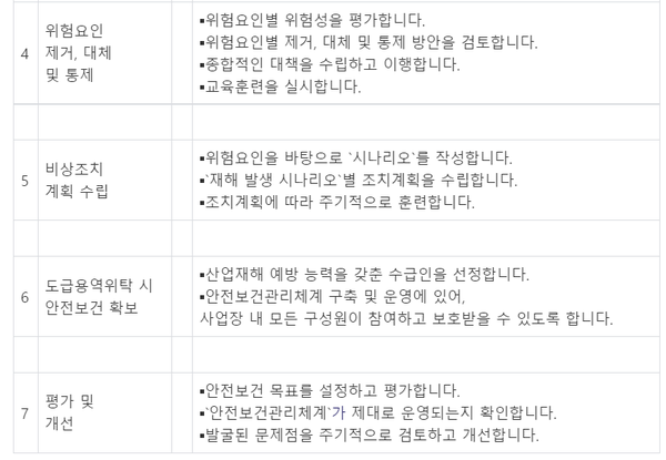 5. 비상조치계획수립: 급박히 발생한 위험에 대응할 수 있는 절차를 마련해야 한다.