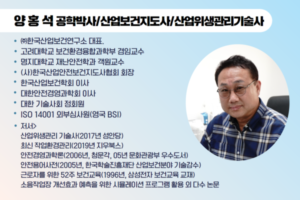 ※ (주)한국산업보건연구소 양홍석 대표는 현재 고려대학교 보건환경융합과학부와 숭실대학교 안전융합대학원의 겸임교수로서, 융합적 사고를 가진 안전보건전문가를 양성하기 위해 힘쓰고 있다.